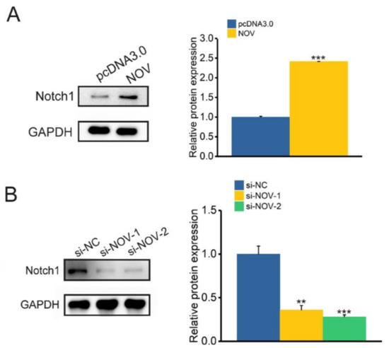 The effect of NOV on the Notch1 pathway. (A) The effect of NOV overexpression on Notch1 protein. (B) The effect of NOV silencing on Notch1 protein. ** indicates p < 0.01 and *** indicates p < 0.001.