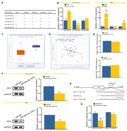 NOV is the direct target of miR-92a-3p. (A) Related miRNAs of NOV via different prediction methods. (B). Expression levels of miR-92a-3p, miR-30e-5p and miR-455-5p in HCCC-9810 (left) and RBE (right) cells. (C) Relative expression level of miR-92a-3p in tumor and adjacent normal samples. (D) Expression correlation of miR-92a-3p and NOV. (E) The effect of miR-92a-3p on NOV mRNA in HCCC-9810 (left) and RBE (right) cells. (F) The effect of miR-92a-3p on NOV protein in HCCC-9810 (up) and RBE (down) cells. (G). The binding site of miR-92a-3 and NOV (3′UTR WT and 3′UTR MUT). (H) Luciferase activity measurements of WT and MUT after cotransfection of NOV 3′UTR WT or NOV 3′UTR MUT and miR-92a-3p mimic or miR-NC. *** indicates p < 0.001.