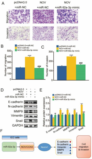 miR-92a-3p contributes to cell transformation and migration mediated by NOV. (A). Transwell analysis of migratory and invasive ability after transfection of miR-92a-3p mimics and NOV overexpression plasmid in HCCC-9810 cells. (B–C) The number of migratory (B) and invasive ability (C) after transfection of miR-92a-3p mimics and NOV overexpression plasmid in HCCC-9810 cells. (D–E) Expression levels of E-cadherin, N-cadherin, MMP9, vimentin and Snail after transfecting miR-92a-3p mimics and NOV overexpression plasmid in HCCC-9810 cells based on Western blot. (F) Schematic figure indicating the miR-92a-3p /NOV/Notch1 regulatory pathways and resulting biological effects in ICC. pcDNA3.0 + miR-NC vs. NOV + miR-NC: ** indicates p < 0.01, *** indicates p < 0.001; NOV + miR-NC vs. NOV + miR-92a-3p mimic: # indicates p < 0.05, ## indicates p < 0.01, ### indicates p < 0.001.