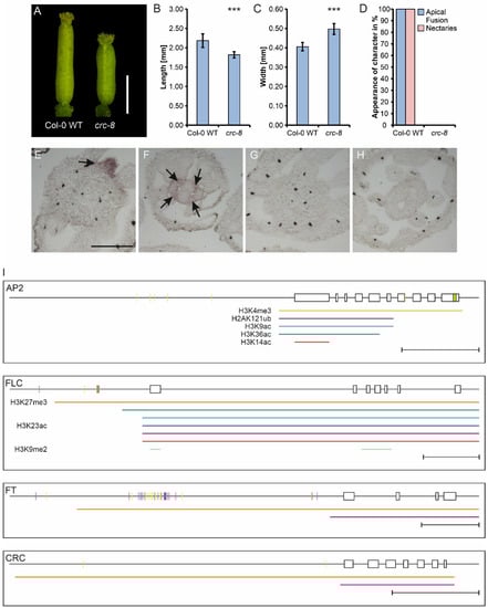 Arabidopsis thaliana crc-8 phenotype and summary of gene-expression regulation of AP2, FLC, FT, and CRC. (A) Representative gynoecia of Col-0 wild type and crc-8 plants. Scale bar represents 1 mm. Statistical analysis of gynoecium length (B), width (C), and a summary of absence or presence of other described crc-1 phenotypes in crc-8 (D). Both length and width comparisons (B,C) are the means with standard deviation. Percent values are shown in (D). Student’s t-test was applied to compare the wild-type gynoecia with crc-8 and significant differences were marked with up to three asterisks (p < 0.001), n = 100. (E–H) Spatial analysis of CRC expression with RNA in situ hybridization. In situ hybridization using a CRC antisense probe of A. thaliana Col-0 wild type (E,F) and crc-8 (G,H), showing gynoecia (E,G) and nectaries (F,H). Nectaries and internal CRC expression marked with arrows. (I) Summary of gene-expression regulation of AP2, FLC, FT, and CRC. Shown are the promoter regions and the exon or intron structure of the respective gene with exons shown as boxes. DNA methylation is shown in short purple (CG), blue (CHG), and yellow (CHH) vertical lines. Colored horizontal lines under the genomic locus indicate regions of histone modifications identified with PlantPAN in leaf tissue: the activating marks H3K4me3 (yellow), H3K9ac (light blue), H3K14ac (red), H3K23ac (dark blue), H3K36ac (dark green), and the repressing marks H2AK121ub (magenta), H3K9me2 (light green), and H3K27me3 (orange). Sorting into activating or repressing marks was performed according to [1,2]. miRNA binding is indicated by a green box in the respective exon. Scale bars represent 1 kB. The ChIP-Seq data used for histone mark identification resulted from only vegetative plant material (seedlings, leaves, roots, and shoot apical meristems or young inflorescence meristems), thus resembling only the state of histone modifications in these tissues.