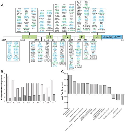 Analysis of transcription factors binding to the CRC promoter identified by Yeast One-Hybrid analysis. (A) Spatial distribution of transcription factor binding sites summarizing the Y1H screen of proCRC with transcription factor bait libraries using the fragments indicated in Supplemental Figure S1 as prey. Shown are only transcription factors with a known motif in PlantPan. Binding site proteins in black were identified by Y1H, those in blue by PlantPAN in silico prediction, and those in green indicate positional overlap of Y1H and PlantPAN data. (B) Quantitative analysis of putative CRC regulators’ distributions across the different fragments of proCRC. The number of regulators identified by in silico prediction with PlantPAN per 100 bp is shown in light grey, and the number of transcription factor binding sites identified by the Y1H screen per 100 bp are shown in dark grey. (C) GO enrichment analysis, categorizing the putative CRC regulators in different functional groups. Shown is the log 2-fold enrichment of significantly overrepresented GO terms.