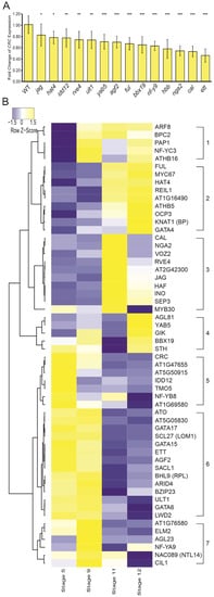 Quantitative effect of regulator mutants on CRC expression and digital gene expression analysis of putative CRC regulators. (A) CRC expression in candidate mutant lines in relation to CRC expression of Col-0 wild-type buds given as mean values of the fold change of CRC expression, error bars indicate standard deviation. (B) Heatmap of CRC and co-expressed putative regulators during four carpel developmental stages [63], showing correlation of expression by hierarchical clustering. Color intensity represents z-score. * p < 0.05, ** p < 0.01, *** p < 0.001.