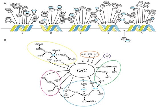 Networks regulating CRC expression. (A) Localization and binding of CRC regulators based on Y1H and qRT-PCR results and [65]. Regulators were assigned to the conserved regions of proCRC (A–E) accordingly to the Y1H screen and in silico prediction analyses. Proteins without an arrow were not tested via qRT-PCR but interact with proteins identified in this study based on BioGRID searches [3]. Protein–protein interactions are symbolized by overlapping circles and proteins in blue were not present in the Y1H results, but link identified regulators to each other. Protein interactions are shown by overlapping circles, transcriptional activation and repression are symbolized by pointed or blunt-end arrows, respectively. (B) Contribution of flower-related processes to CRC expression. Colored circles indicate cofunctional networks with flowering induction in yellow, ab-/adaxial regulation in orange, carpel structures in dark blue, auxin response in green, meristem regulation in light blue, and flower development in purple. Protein interactions are shown by bars with two circles, transcriptional activation and repression are symbolized by pointed or blunt-end arrows, respectively.