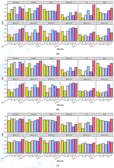 Performance metrics for different clustering algorithms. JCCI, ARI, and NMI are determined through the true cell-type labels. (a) Jaccard index for 12 single-cell sequencing datasets; (b) Adjusted rand index for 12 single-cell sequencing datasets; (c) Normalized mutual information for 12 single-cell sequencing datasets.