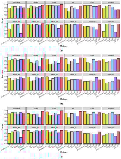 Precision, recall, and F-scores of the identification for DEGs through different clustering results. Please note that DEGs are identified through MAST [31] based on the true and predicted cell-type labels. (a) Recall of the identification for DEGs. Higher recall represents that a greater number of true DEGs are detected by group comparison; (b) Precision of the identification for DEGs. Higher precision indicates that there are smaller number of false DEGs in the prediction results; (c) F-scores of the identification for DEGs.