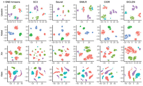 Additionally, we compared the low-dimensional visualization of the imputation results through t-SNE. We obtained the two-dimensional coordinates for each cell using t-SNE and highlighted their labels based on the true cell types. The low-dimensional visualization through the imputation results using the predicted labels by SC3 and Seurat can divide the same cell types into multiple small clusters (Figure 5). Since SC3 and Seurat can overestimate the number of clusters, it can make multiple small clusters even though it is originally in the same types. In fact, if one can use the imputation and visualization results without the true cell-type labels (i.e., without the color labeling in the figure), it may have a risk to yield incorrect analysis results such as the number of clusters (i.e., cell types). Additionally, for the Usoskin, Xin, and Klein datasets, SIMLR and CIDR collect the different cell types into a single cluster. However, SICLEN can yield clear visualization for various cell types, where it can collect cells with the same types into a same cluster and separate cells with different cell types into different groups. Overall, the imputation results based on the clustering labels predicted by SICLEN can yield the clear separation for the different cell types and the tight collection for the same cell types. Based on the results, we verified that the predicted clustering labels obtained by SICLEN is relatively confident than the other algorithms, and it has a great compatibility to other single-cell analysis algorithms.
