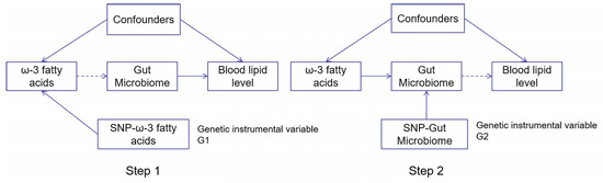 The flowchart showing the two-step Mendelian randomization methods used in this study. Step 1: Analysis of the association of ω-3 fatty acids on blood lipid levels using Single-nucleotide polymorphism (SNP) loci associated with ω-3 fatty acids as a proxy tool. Step 2: Analysis of the effect of the gut microbiome variation on blood lipid level using SNP loci associated with gut microbiome variation as a proxy tool for intermediate variables. Both genetic instrumental variables were independent of confounders. Tables S9–S11 show the detailed process results of MR analysis.