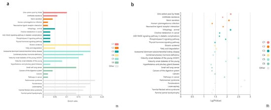 The enriched KEGG pathways of differentially methylated genes. (a) The enriched KEGG pathways of differentially methylated genes visualized in the bar plot. Each row represents an enriched function, and the length of the bar represents the enrich ratio, which is calculated as “input gene number”/” background gene number”. The color of the bar (C1–C6) represents different clusters, the terms in the same cluster have the similar functions. For each cluster, if there are more than 5 terms, the top 5 with the highest enrich ratio will be displayed. The enrichment analysis was conducted using KOBAS. (b) The enriched KEGG pathways of differentially methylated genes visualized in bubble plot. Each bubble represents an enriched function, and the size of the bubble from small to large: (0.05,1), (0.01,0.05), (0.001,0.01), (0.0001,0.001), (1 × 10−10, 0.0001), (0, 1 × 10−10). The color of the bubble (C1–C6) is the same as the color of the bar, which represents different clusters. For each cluster, if there are more than 5 terms, the top 5 with the highest enrich ratio will be displayed. The enrichment analysis was conducted using KOBAS.