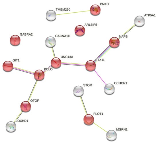 Moreover, UNC13A and OTOF are included in the ten annotated genes. Both the UNC13A and OTOF genes are associated with neuropathy. OTOF: Mutations in this gene are a cause of neurosensory nonsyndromic recessive deafness. The homology suggests that this protein may be involved in vesicle membrane fusion. Several transcript variants encoding multiple isoforms have been found for this gene (https://www.ncbi.nlm.nih.gov/gene/9381, accessed on 28 September 2021). UNC13A: This gene encodes a member of the UNC13 family. UNC13 proteins play important roles in neurotransmitter release at synapses [14]. Single nucleotide polymorphisms in this gene may be associated with sporadic Amyotrophic lateral sclerosis (ALS) (https://www.ncbi.nlm.nih.gov/gene/23025, accessed on 28 September 2021).