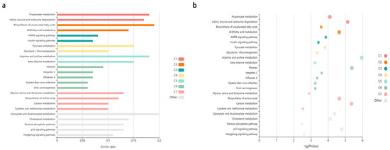 The enriched KEGG pathways of differentially expressed genes. (a) The enriched KEGG pathways of differentially expressed genes visualized in the bar plot. Each row represents an enriched function, and the length of the bar represents the enrich ratio, which is calculated as “input gene number”/”background gene number”. The color of the bar represents different clusters. For each cluster, if there are more than 5 terms, the top 5 with the highest enrich ratio will be displayed. The enrichment analysis was conducted using KOBAS. (b) The enriched KEGG pathways of differentially expressed genes visualized in bubble plot. Each bubble represents an enriched function, and the size of the bubble is from small to large: [0.05,1], [0.01,0.05], [0.001,0.01], [0.0001,0.001], [1 × 10−10,0.0001] and [0,1 × 10−10]. The color of the bubble is the same as the color of the bar above, which represents different clusters. For each cluster, if there are more than 5 terms, the top 5 with the highest enrich ratio will be displayed. The enrichment analysis was conducted using KOBAS.
