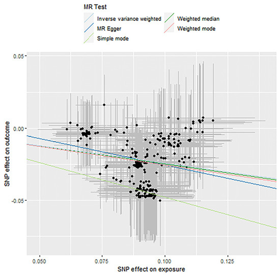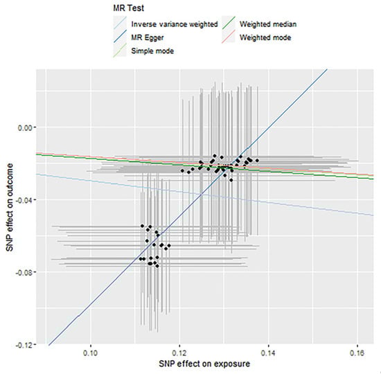 Then, the R package “TwoSampleMR” [13] was used for Mendelian randomization analysis. In this part, Inverse Variance Weighting (IVW), Weighted Median (WM) and MR Egger regression were used as the main causal effect estimations. Among them, the IVW method focuses on integrating multiple genetic variants to infer the causal relationship between exposure factors and outcome variables. It is a weighted linear regression of Walder ratios calculated from different SNPs to obtain the causal relationship of unbiased estimation. WM is a weighted density function for ratio estimation. Multiple genetic effect values can be integrated by assigning different weight values to each genetic variable. If at least half of the information in the analysis comes from valid instrumental variables, then the causal effects can be continuously estimated. MR Egger takes gene pleiotropy into account, and the principle is the same as for IVW, but the difference is that the intercept term for IVW must be 0. In contrast, it is not necessarily the case for MR Egger, where the intercept is used to check whether there exist genetic pleiotropy. When the intercept corresponds to a statistic with a p-value > 0.05, it means that the causal effect is not influenced by genetic pleiotropy. The advantage of comparing the results from three different approaches is higher reliability due to increased consistency. A flowchart summarizing the two-steps diagram is presented in Figure 1.