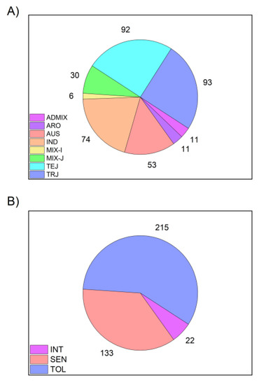 Seeds of 370 O. sativa accessions from the Rice Diversity Panel 1 (RDP1) were obtained from the Genetic Stocks-Oryza (GSOR) collection located at the USDA-ARS Dale Bumpers National Rice Research Center (USDA-ARS DBNRRC; Stuttgart, AR). The 370 RDP1 accessions utilized in this study represented eight subpopulations (Figure 1): aus (53 accessions), indica (74), aromatic (11), temperate japonica (92), tropical japonica (93), admixtures of two or more indica and aus accessions (6), admixtures of two or more temperate japonica and tropical japonica accessions (30), and admixtures of one or more accessions from temperate japonica and tropical japonica with one or more accessions from the indica and aus subpopulations (11). RDP1 accessions were genotyped by McCouch et al. 2016 [38]. Based on previous told tolerance response experiments, we assigned temperate japonica and tropical japonica accessions, as well as admixtures between them to the Cold Tolerant cluster (TOL), aromatic accessions and admixtures between two subspecies to the Intermediate Cold Tolerant cluster (INT), and aus and indica accessions, as well as admixtures between them to the Cold Sensitive cluster (SEN) [40,44,45].