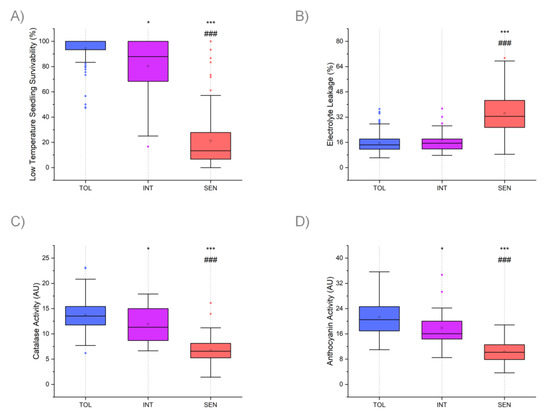Box plots of mean values for four phenotypes after a 7-day-10 °C chilling treatment for accessions of three cold tolerance clusters (see Figure 1 for details). (A) Low Temperature Seedling Survivability (LTSS) values for rice accessions of the three cold tolerance clusters. (B) Electrolyte Leakage (EL) values measuring membrane integrity after chilling stress for rice accessions of the three cold tolerance clusters. (C) Catalase (CAT) Activity values measuring enzymatic antioxidative activity for rice accessions of the three cold tolerance clusters. (D) Anthocyanin (ANT) Activity values measuring non-enzymatic antioxidative activity for rice accessions of the three cold tolerance clusters. TOL: Cold Tolerant; INT: Intermediate Cold Tolerant; SEN: Cold Sensitive. Significant differences compared to the TOL cluster are labeled by the symbol “*”. Significant differences compared to the INT cluster are labeled with the symbol “#”. ***/###: p < 0.001; *: p < 0.05.