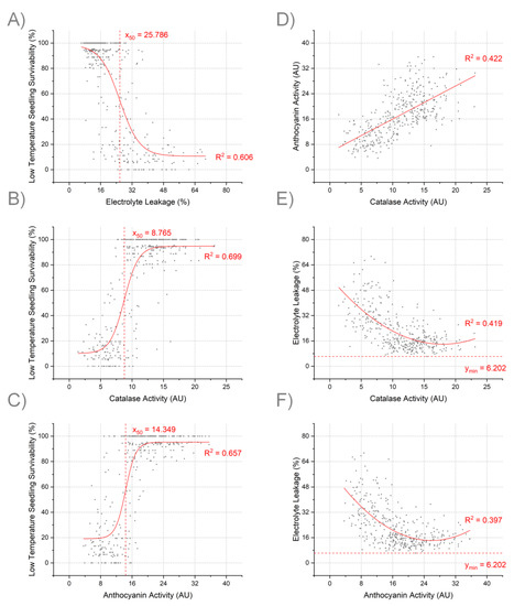 Correlation analyses of four chilling tolerance phenotypes after a 7-day-10 °C treatment. Each dot shows the correlation for one accession. (A–C) Correlations between LTSS and EL, CAT, and ANT, respectively. A Boltzmann Sigmoid fit is shown based on best-fit model calculations. X50 and the line y = X50 show values at which EL, CAT, ANT are halfway between high LTSS and low LTSS. (D) Correlations between CAT and ANT activities. A linear fit is shown based on best-fit model calculations. (E,F) Correlations between EL, and CAT and ANT, respectively. An Exponential Decay fit is shown based on best-fit model calculations. The line x = ymin shows the lowest EL value after reaching the plateau for the curve.