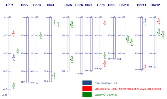 Genomic locations of 20 Multiple-Phenotype (MP) QTL. Numbers along the chromosomes (Chr) are million-base-pair (Mbp) units. Boxes show regions containing at least one antioxidant QTL (qCAT; qANT) overlapping with another QTL (qLTSS; qEL; qCAT; or qANT). Blue boxes show regions of novel cold stress tolerance QTL identified in this study; red boxes show regions of qMPs overlapping with cold stress tolerance QTL reported in Schläppi et al. 2017 [37] and Shimoyama et al. 2020 [40]; green boxes show qMPs overlapping with some legacy seedling stage cold stress tolerance QTL reported in the last five years (Lv et al. 2016 [46], and Wang et al. 2016 [47]).
