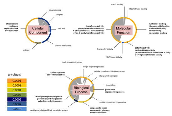For Biological Process, 17 GO terms were selected after accounting for similarities. From these, there were four distinct clusters shared by at least half of the contributing genes. The first cluster was for “cell recognition” and “cell communication”. The second cluster was for “pollination” and “reproductive process”. The third cluster was for “response to stress”, “response to stimulus”, and “defense response”. And the fourth cluster was “carbohydrate phosphorylation”, “pectin biosynthetic process”, and “xylan biosynthetic process”. Within the first cluster, the terms “cellular protein modification process” and “oligo peptide transport” were the most significant (Figure 5).