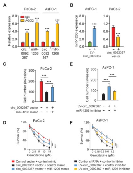 In addition, we conducted the RIP assay to extract circ_0092367 and miR-1206 with anti-AGO2 antibody PC cells. The results demonstrated that circ_0092367 and miR-1206 were pulled down by anti-AGO2 antibody, but not by anti-IgG (Figure 5A), supporting that circ_0092367 binds to miR-1206. Furthermore, we showed that the overexpression of circ_0092367 inhibited miR-1206 expression, while the downregulation of circ_0092367 induced miR-1206 expression (Figure 5B), suggesting that circ_0092367 sponges miR-1206 in PC cells. We also investigated whether circ_0092367 shows its tumor-suppressive role via sponging for miR-1206. Cell invasion assays and CCK-8 assays showed that the miR-1206 mimic could functionally restore circ_0092367 overexpression-suppressed cell invasion and gemcitabine resistance (Figure 5C,D). On the other hand, the miR-1206 inhibitor can significantly prevent circ_0092367 knockdown-enhanced cell invasion and gemcitabine resistance (Figure 5E,F). Therefore, circ_0092367 inhibits the invasion of PC cells and reverses the resistance of PC cells to gemcitabine through reducing miR-1206 expression.