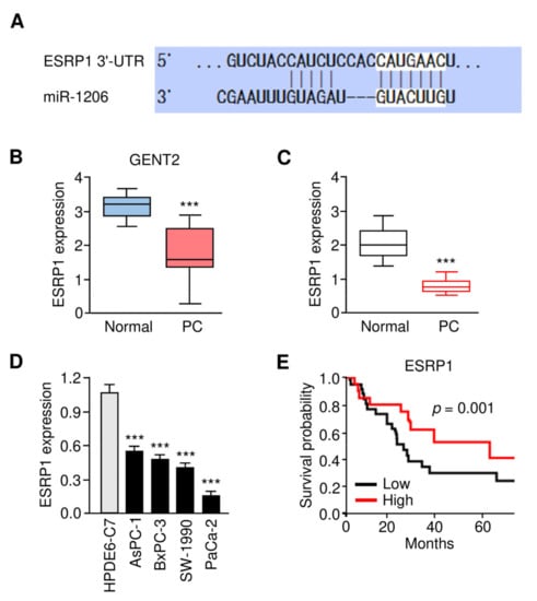 The Expression Pattern and Prognostic Significance of ESRP1 in PC. (A) The complementary sequence between miR-1206 and ESRP1 mRNA (TargetScan database). (B) ESRP1 expression in PC tissues and adjacent normal samples (GENT2 database). (C) ESRP1 mRNA expression in PC tissues and normal samples was examined using the qRT-PCR assay. (D) qRT-PCR analysis of ESRP1 mRNA expression in PC cells and normal cells. (E) Kaplan–Meier survival analysis of PC patients with lower or higher ESRP1 expression. The experiments in (D) were repeated three times independently with similar results. *** p < 0.001.