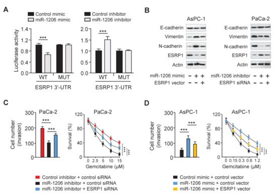 To test whether miR-1206 directly regulates ESRP1 expression, we performed luciferase assays. Luciferase activities of the WT ESRP1 3′-UTR reporter vector were repressed by the miR-1206 mimic, and were elevated by the miR-1206 inhibitor (Figure 7A). Mutation of the miR-1206 putative binding sequence eliminated these effects (Figure 7A). Then, we examined the expression of the EMT-related genes and ESRP1 in AsPC-1 cells transfected with the miR-1206 mimic with (or without) the ESRP1 vector, and in PaCa-2 cells transfected with the miR-1206 inhibitor with (or without) ESRP1 siRNA. The results demonstrated that the overexpression of miR-1206 reduced E-cadherin expression, and induced N-cadherin and Vimentin levels (Figure 7B). However, the forced expression of ESRP1 reversed these changes (Figure 7B). Alternatively, the knockdown of miR-1206 induced E-cadherin levels, whereas it attenuated the levels of N-cadherin and Vimentin (Figure 7B). These changes were reversed by the transfection of ESRP1 siRNA (Figure 7B). We also performed rescue experiments and showed that miR-1206 knockdown decreased cell invasion and gemcitabine resistance, while the silencing of ESRP1 reversed these effects of miR-1206 (Figure 7C). MiR-1206 overexpression increased cell invasion and gemcitabine resistance, while these changes were largely reversed by the ectopic expression of ESRP1 (Figure 7D).