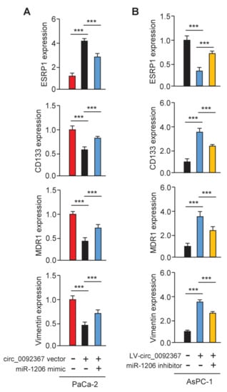 Circ_0092367 Regulates the Expression of ESRP1 via MiR-1206. (A) qRT-PCR analysis of ESRP1, CD133, MDR1, and Vimentin levels in circ_0092367-overexpressing PaCa-2 cells overexpressing miR-1206 mimic and in control cells. (B) qRT-PCR analysis of ESRP1, CD133, MDR1, and Vimentin expression in circ_0092367-knockdown AsPC-1 cells with miR-1206 silencing and in control cells. The experiments in (A,B) were repeated three times independently with similar results. *** p < 0.001.
