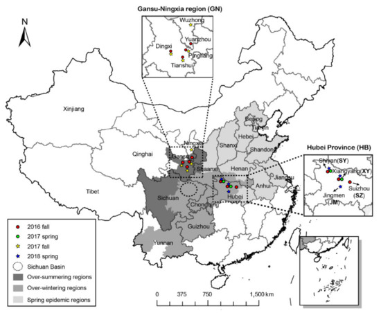 In this study, we compared the diversity levels and genetic structures of Pst in the Gansu–Ningxia region (GN) in two fall seasons with those in HB in the subsequent spring seasons to infer the possible migration from GN to HB. The objectives of this study were to (i) determine the genetic structure of Pst in different seasons in HB and (ii) identify possible Pst migration events between the GN and HB populations using various phylogenetic analysis methods.