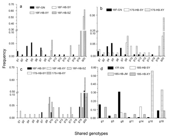 The level of genotype exchange could be determined by assessing the shared genotypes among subpopulations. In accordance with the relationship between the two successive seasons in HB, only 4 (g10, g17, g19, and g20) of 69 genotypes (Supplementary file 1: Table S1) were shared, and g20 was the dominant genotype (Figure 2c). Of 208 genotypes, 10 were shared between the GN and HB subpopulations in the 2016–2017 season (Figure 2a, b) 7 seven were shared in the 2017–2018 season (Figure 2d). Thus, there was a small level of pathogen population exchange between the GN and HB subpopulations, as revealed by the limited number of common genotypes.
