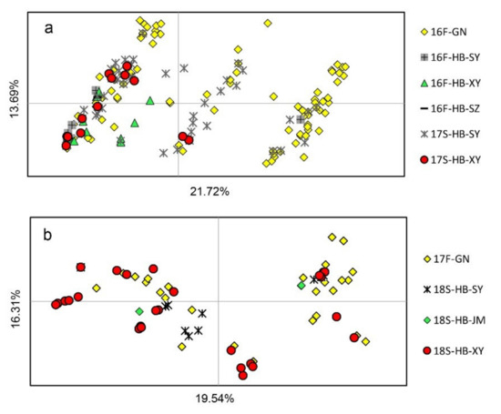 PCoA showed that the horizontal and vertical coordinates represented 21.72% and 13.69%, respectively, of the total genetic variance in the 2016–2017 season and 19.54% and 16.31%, respectively, in the 2017–2018 season (Figure 3). The 16F-GN sample was located in all four quartiles, whereas the 16F-HB-SY, 16F-HB-XY, and 16F-HB-SZ samples were mostly located in the second and third quartiles (Figure 3a). This result indicated a certain separation of the HB population from the GN subpopulation in 16F. However, the genotypes in 17S- and 18S-HB were mixed with parts of genotypes in 16F-GN and 17F-GN, respectively (Figure 3a,b), suggesting that a small level of population exchange exists between the fall subpopulations in GN and the spring subpopulations in HB.