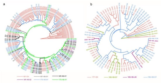 The phylogenetic analysis showed similar results with PCoA and Bayesian assignment analysis. The isolates of 16F-HB were mainly clustered with 17S-HB, and a small number of isolates in 16F-GN had closed genetic relationships with 17S-HB (Figure 5a). Similarly, some isolates of 17F-GN were mixed with 18S-HB (Figure 5b).