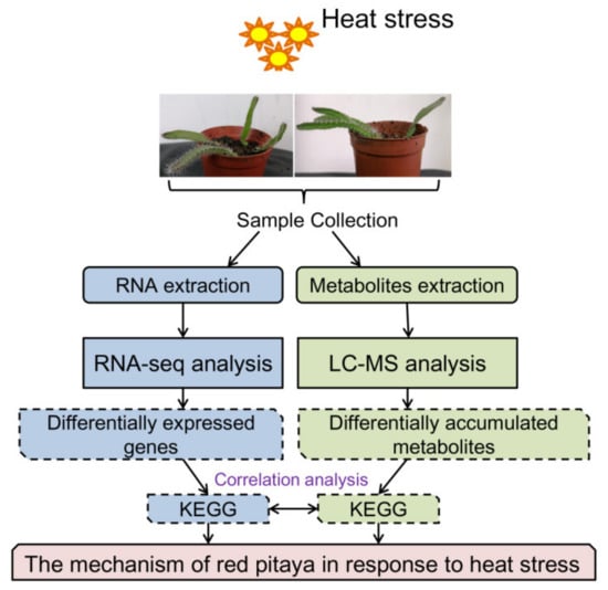 The physiological and molecular mechanisms underlying the response of plants to HS are complex and depend on diverse signal transduction pathways, genes, and metabolites [,]. Transcriptomic analysis is an effective and widely used technique to identify genes associated with heat tolerance [,,]. Many heat-responsive genes have been identified, including HSPs, HSFs, WRKYs, MYBs, and NACs [,,]. Metabolomic analysis has become an effective means to study plant responses to biotic and abiotic stress [,,]. An integrative transcriptomic and metabolomic analysis of pitaya in response to HS could provide novel insights into the mechanism by which plants respond to HS.
