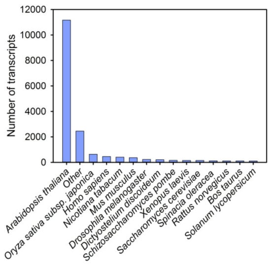 In total, 16,856 unique transcripts were successfully mapped to 6215 protein sequences in the Swiss-Prot database, which was associated with 427 species. The species with the most hits was Arabidopsis thaliana (66.2%), followed by Oryza sativa subsp. japonica (3.8%), Homo sapiens (2.7%), and Nicotiana tabacum (2.4%) (Figure 2 and Table S3). This result indicates that red pitaya is closely related to Arabidopsis thaliana, as expected. Similar results were obtained after performing a query against the NCBI RefSeq RNA database, and 17,194 transcripts were successfully mapped (Table S4).