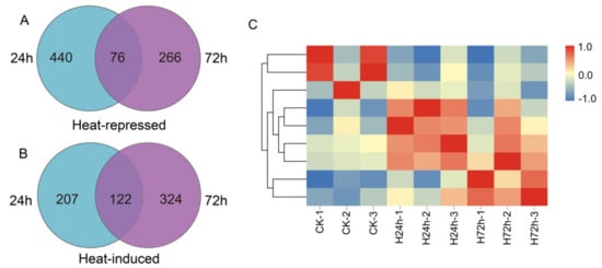 Overview of transcriptome analysis. (A) Venn graph for 24 h and 72 h based on heat downregulated (repressed) genes. (B) Venn graph for 24 h and 72 h based on upregulated (induced) genes. (C) The heatmap of the DEGs in RNA-seq analysis. CK: control for 0 h; H24h: heat stress for 1 h; H72h: heat stress for 72 h.