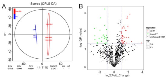 OPLS-DA was used to analyze the data. The prediction parameters of the evaluation model were R2X, R2Y, and Q2, where R2X and R2Y represent the interpretation rate of the model and the X and Y matrixes, respectively, and Q2 represents the prediction ability of the model. The model is more stable the closer the three indicators are to 1. The model can be considered valid if Q2 > 0.5 and excellent if Q2 > 0.9. For samples with biological replicates, the p-value of Student’s t-test and the VIP value of the OPLS-DA model were combined to screen the differential metabolites. The criteria were p < 0.05 and VIP > 1.
