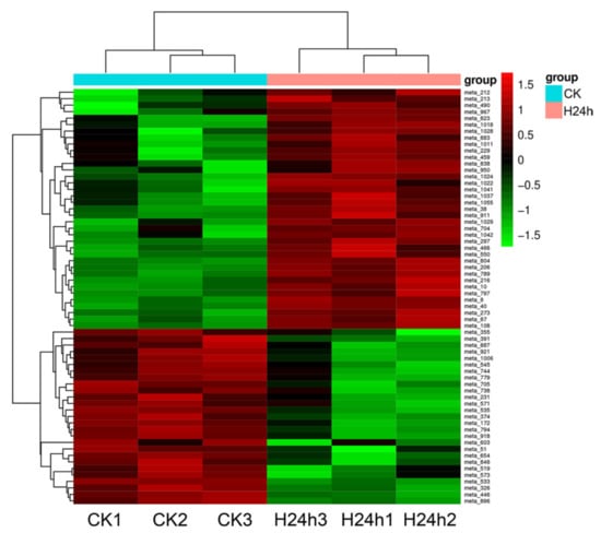 Heatmap of all differentially accumulated metabolites for H24h. CK, the control group; H24h, the 24 h heat stress group.