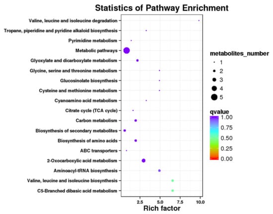 To obtain a better understanding of the characteristics of the compounds involved in metabolic processes, we conducted a KEGG enrichment analysis for the detected metabolites. The differentially accumulated metabolites were mapped to different pathways (Table 5 and Table S9). Among these pathways, “metabolic pathways (ko01100),” “biosynthesis of secondary metabolites (ko01110),” “2-oxocarboxylic acid metabolism (ko01210),” “carbon metabolism (ko01200),” and “biosynthesis of amino acids (ko01230)” were the top five enriched pathways (Figure 7).
