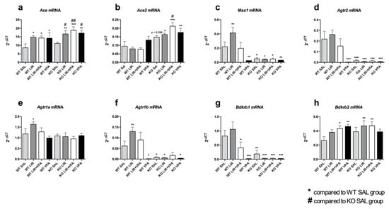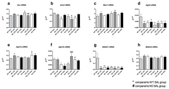 The qPCR was performed on a QuantStudio 12K Flex Real-Time PCR System (Applied Biosystem, Waltham, MA, USA) using the Taqman Gene Expression Mastermix (Thermo Fisher Scientific, Waltham, MA, USA) and the following TaqMan Gene Expression Assays: Ace (Rn00561094_m1), Ace2 (Rn01416293_m1), Agtr1a (Rn02758772_s1), Agtr1b (Rn02132799_s1), Agtr2 (Rn00560677_s1), Bdkrb1 (Rn02064589_s1), Bdkrb2 (Rn01430057_m1), Mas1 (Rn00562673_s1) and Wfs1 (Rn00582735_m1). In all the gene expression experiments, the amount of the target gene was normalized to Hprt1 (Hypoxanthine-guanine phosphoribosyltransferase; Rn01527840_m1) or Tbp (TATA box binding protein, Rn01455648_m1) as an endogenous reference control by means of the 2−ΔCt method [].
