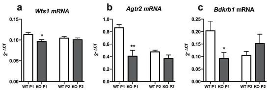 The expression of Agtr2 and Bdkrb1 is downregulated in in vitro primary cortical neurons from Wfs1 KO rats. Rat primary cortical neurons were prepared using the brains of wild-type control or Wfs1 KO rats and cells were cultured 24 h (P1) or 48 h (P2) post-culturing. Gene expression analysis was performed to measure the relative expression level of (a) Wfs1 mRNA, (b) Agtr2 mRNA and (c) Bdkrb1 mRNA. Gene expression level is presented as 2−ΔCT relative to the housekeeper Hprt. Data were compared using unpaired t test; * p < 0.05, ** p < 0.01 compared to respective WT group. The data are presented as the mean ± SEM, n = 6–7 per group.