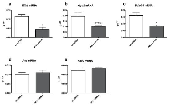 The measurement of the relative expression levels of Wfs1, Agtr2, Bdkrb1, Ace and Ace2 were performed using the primary cortical neurons. The expression of Wfs1 in the neurons was reduced by more than a half after transfection with Wfs1 siRNA (p < 0.05) (Figure 4a). Moreover, similarly to Wfs1, the expression of both Agtr2 (p = 0.07) and Bdkrb1 (p < 0.05) was also decreased in the Wfs1-deficient neurons approximately by a half (Figure 4b,c), suggesting that the expression of these receptors might be dependent on the level of Wfs1. The expression of Ace and Ace2 displayed no change in the Wfs1 knock–down (Figure 4d,e). Treatment with Wfs1 siRNA displayed no effect on the expression of Hprt, the housekeeper used in the expression analysis. Secondly, although the primary culture of cortical neurons may contained some glial cells, both types of cells expressed RAAS and KKS components.