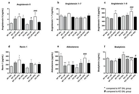 It was further tested whether genotype and acute LIR or VPA treatment impact on the levels of aldosterone and bradykinin, the main executors of RAAS and KKS. Therefore, the serum peptide levels were analyzed. It was revealed that the level of aldosterone, the downstream facilitator of RAAS, was nearly four times lower in the Wfs1 KO animals compared to the WT (p < 0.001). Treatment with LIR and VPA tended to increase aldosterone levels and LIR + VPA co-treatment normalized the level seen in Wfs1 KO, increasing it by approximately three times (p < 0.001) (Figure 5e). By contrast, bradykinin was increased in the serum of the Wfs1 KO (p < 0.01); however, both LIR (p < 0.001) and VPA (p < 0.05) and their combination (p < 0.001) decreased bradykinin to the basal level in the WT animals (Figure 5f). This is in concordance with the treatment-dependent decrease in Bdkrb1 expression levels (Figure 1g and Figure 2g) []. Additionally, the level of angiotensin II was increased by LIR, VPA or LIR + VPA, both in the Wfs1 KO (pLIR < 0.05, pLIR + VPA < 0.001, pVPA = 0.25) and in the WT (pLIR < 0.05, pLIR + VPA < 0.01, pVPA < 0.05) (Figure 5a), as well as the level of renin (Figure 5d, statistically insignificant), which forms angiotensin I, the precursor of angiotensin II. Further, LIR + VPA co-treatment elevated the serum levels of Ang-(1–9) independent of genotype (p < 0.01 and p < 0.001, in the WT and Wfs1 KO, respectively) (Figure 5c). In the case of Ang-(1–7) a slight, albeit statistically insignificant, increase was observed in response to the co-treatment in the WT, but not in the WS animals (Figure 4b).