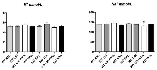 Na+ and K+ levels measured in 3.5–4-month-old animals’ blood serum after 8 days of treatment with liraglutide (LIR), valproate (VPA), liraglutide + valproate (LIR + VPA), or saline (SAL). Electrolyte levels were determined using Ion-Selective Electrode (ISE) indirect Na-K-Cl for Gen.2 package insert of the Roche/Hitachi cobas c systems (Roche Diagnostics) and are presented as mmol/L. Data were compared using factorial ANOVA followed by Fisher’s LSD post hoc tests; # p < 0.05 compared to KO vehicle (SAL) group. The data are presented as the mean ± SEM, n = 6–8 per group.