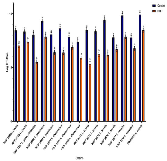 Effect of high hydrostatic pressure on the survival of LAB strains. Presented data are the mean of the two independent experiments and the standard deviations are indicated with vertical bars, (a) control strain (b) after HHP strain. The bars with different letters are significantly different (p < 0.05).