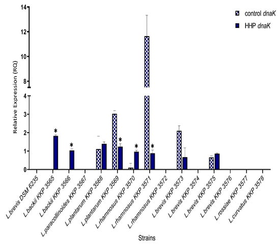 An increase of the dnaK expression level in six strains (L. backii KKP 3565, L. backii KKP 3566, L. paracollinoides KKP 3567, L. plantarum KKP 3568, L. rhamnosus KKP 3570, L. brevis KKP 3575) and decrease in three strains (L. plantarum KKP 3569, L. rhamnosus KKP 3571, L. brevis KKP 3573) in comparison to control strains were noticed. The relative expression level of the dnaK in L. brevis DSM 6235, L. paracollinoides KKP 3567, L. rhamnosus KKP 3572, L. brevis KKP 3574, L. brevis KKP 3576, L. rossiae KKP 3577, L. curvatus KKP 3578 was found to be below to detected limit. Moreover, for five strains, L. backii KKP 3565, L. backii KKP 3566, L. plantarum KKP 3569, L. rhamnosus KKP 3570, L. rhamnosus KKP 3571, the dnaK expression level was statistically significant (p < 0.05) between the control and HHP treated groups (Figure 2).