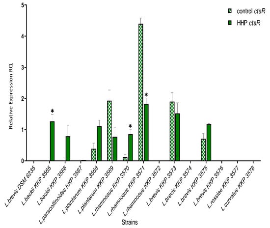 For the ctsR gene, an increase of expression for five (L. backii KKP 3565, L. backii KKP 3566, L. plantarum KKP 3568, L. rhamnosus KKP 3570, L. brevis KKP 3575) strains and a decrease for the three strains (L. plantarum KKP 3569, L. rhamnosus KKP 3571, L. brevis KKP 3573) was noticed. Furthermore, for three strains, L. backii KKP 3565 and L. rhamnosus KKP 3570, L. rhamnosus KKP 3571, statistically significant differences (p < 0.05) in the level of the ctsR expression between control and HHP treated was observed. However, for seven strains (L. brevis DSM 6235, L. paracollinoides KKP 3567, L. rhamnosus KKP 3572, L. brevis KKP 3574, L. brevis KKP 3576, L. rossiae KKP 3577, L. curvatus KKP 3578) the level of ctsR expression was found both before and after the HHP treatment, under detection limit (Figure 3).