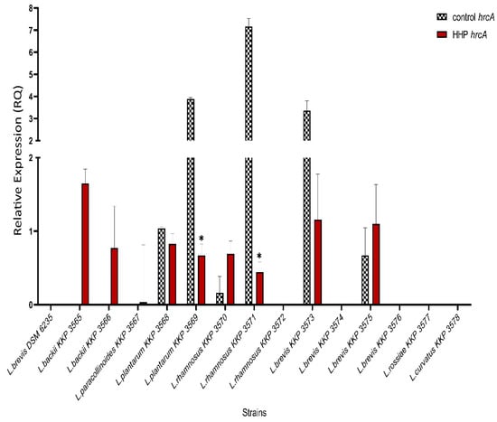 For hrcA increase of the expression was observed in L. backii KKP 3565, L. backii KKP 3566, L. paracollinoides KKP 3567, L. rhamnosus KKP 3570, and L. brevis KKP 3575 strains, decrease in four strains (L. plantarum KKP 3568, L. plantarum KKP 3569, L. rhamnosus KKP 3571, L. brevis KKP 3573), and for the seven strains (L. brevis DSM 6335, L. paracollinoides KKP 3567, L. rhamnosus KKP 3572, L. brevis KKP 3574, L. brevis KKP 3576, L. rossiae KKP 3577, L. curvatus KKP 3578) no expression was observed. For L. plantarum KKP 3569 and L. rhamnosus KKP 3571 the differences in the hrcA expression between control and HHP treated groups were statistically significant (p < 0.05) (Figure 4).