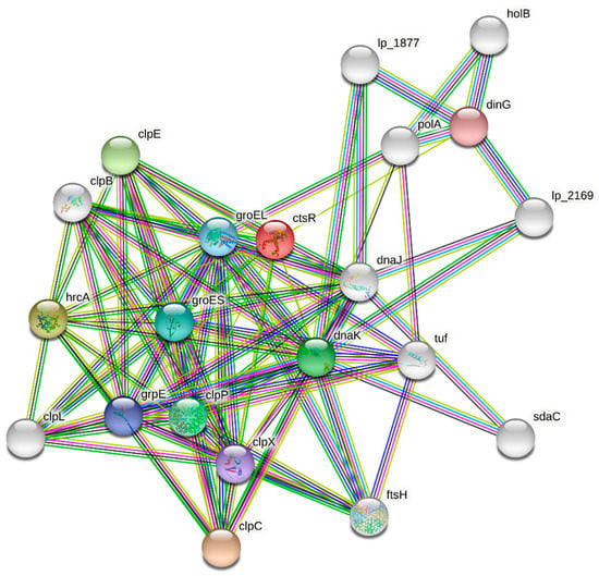 The Search Tool for the Retrieval of Interacting Genes—STRING database (string-db.org) [] was used to seek potential interactions between differentially expressed dnaK, ctsR, and hrcA molecules, corresponding to different LAB. PPI network was constructed, with the active interaction sources, including experiments, databases, textriming, co-expression, gene fusion, and co-occurrence. In the matrix, the nodes correspond to the proteins, and the edges represent the interactions. Using the interaction score threshold of 0.7 (high confidence) the string PPI analysis (Figure 5) yielded a highly clustered network (clustering coefficient: 0.73) containing 21 nodes with 98 edges (expected number of edges 27), showing significantly more interactions than expected for a random set of similarity size drawn from the genome (enrichment p-value < 0.001). Gene ontology (GO) enrichment analysis of the molecular function included: protein folding, unfolded protein binding, protein binding with FDR (false discovery rate) = 1.42 × 10−0.5.