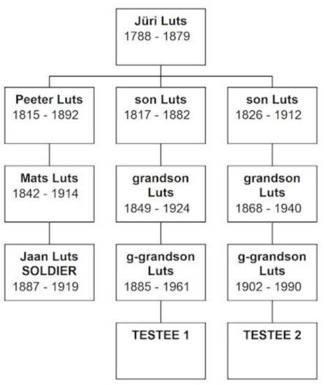 Therefore, for the identification of the exhumed remains, the pedigree of Jaan Luts was considered. He had two brothers, one of them died in 1904 in the Russo-Japanese War, the other brother had two sons who have altogether three daughters (all alive) but had no sons. The two closest living male-line relatives, Testee 1 and Testee 2, were from a common ancestor Jüri Luts (1788–1879), whose documented relationship is shown in Figure 1 [National Archives of Estonia: Soul revision lists, church books, registers of commune members, vital statistics documents].