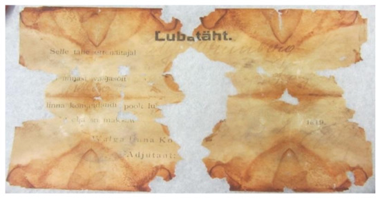 The conservation and restoration made it possible to determine the script on the two paper documents, both on the thin pulp machine-made paper: “Lubatäht” (Permission slip, 10.8 × 16.9 cm) and “Tunnistus” (Certificate, 10.7 × 18.3 cm). The media identified on the paper is as follows: relief print, iron gall ink, stamp ink (Figure 2 and Figure 3, respectively).