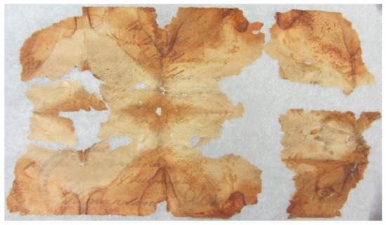The paper content of the wallet was separated into two parts. The conservation was carried out based on the principle of reversibility and conservation ethics [12,13]. Ferrous corrosion was removed and the fragments of the two documents were washed, sized and the fragments reassembled and supported (oxalic acid, methyl cellulose gel, Gore-Tex® sheets (W. L. Gore & Associates Inc., Newark, DE, USA), ethanol, water, blotting paper, Hollytex® (Kavon Filter Products Co, Farmingdale, NJ, USA); lined using light tissue paper, missing fragments were replaced using toned Japanese conservation paper Mulberry Thin; adhesives: diluted methyl cellulose and wheat starch paste). The documents were buffered (Bookkeeper® Deacidification Spray (Preservation Technologies L.P., Cranberry Township, PA, USA), magnesium oxide) using common methods in the practice of paper conservation. As a result of the conservation, the physical integrity of the documents was restored, as well as the determination of the script on the two conserved documents. Ensuring the best storage life of extremely fragile documents, both were enclosed by a specially designed protective enclosure made of archival quality cellulose materials. For text detection, a VSC 6000 video spectral comparator (Foster + Freeman Ltd., Evesham, Worcestershire, UK) was used.