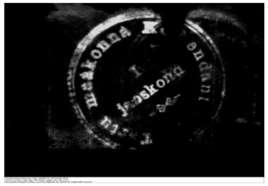Even though the documents were highly damaged, the preserved area on the left side was less damaged, and the stamp impression was detectable using a VSC 6000 video spectral comparator in the infrared luminescence condition, which provided information about the putative issuer of the document (Figure 4).