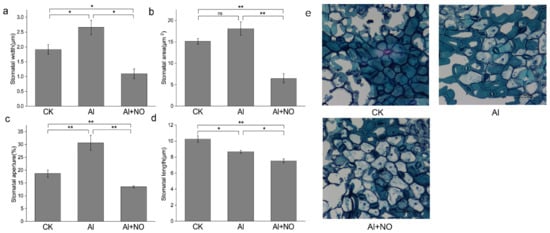 Effects of NO on the stomatal structure of Al-exposed watermelon leaves. (a) Stomata width, (b) stomata area, (c) stomata aperture, (d) stomata length, (e) the stomatal structure of watermelon leaves following the three different treatments. Data are presented as means ± SD of three biological replicates. Asterisks indicate significant differences (* p < 0.05, ** p < 0.01, ns p > 0.05) between the means of the treatment groups and the control groups.