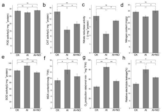 Effects of NO on oxidation stress and nitrogen metabolism of watermelon leaves under aluminum stress. (a) POD, (b) CAT, (c) NR, (d) nitrogen content, (e) SOD, (f) MDA, (g) superoxide anion, (h) relative electrical conductivity. Data are presented as means ± SD of three biological replicates. Asterisks indicate significant differences (* p < 0.05, ** p < 0.01, ns p > 0.05) between the means of the treatment groups and the control groups.